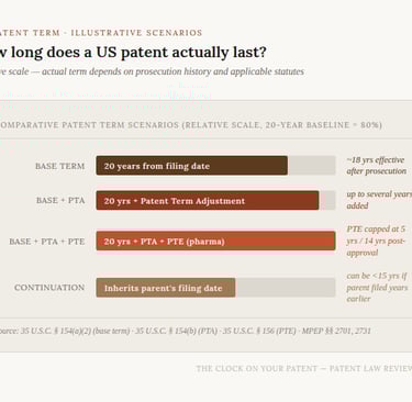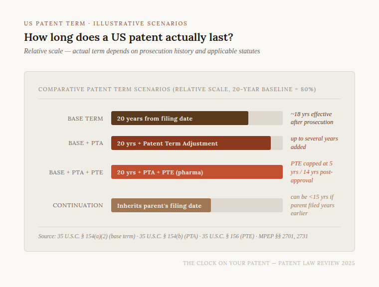 A plain-English guide to US patent term, why it almost never runs the full 20 years, and how the rules compare around the world.