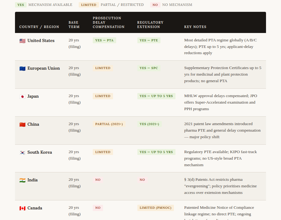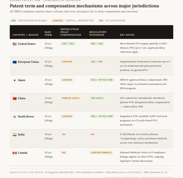 India's approach is strikingly different from the rest. Section 3(d) of the Indian Patents Act explicitly bars patent protection for new forms of known substances unless they demonstrate significantly enhanced efficacy β a direct legislative attack on "evergreening," the practice of filing minor variation patents to extend commercial exclusivity beyond the life of the original compound patent. India also offers no PTA or PTE. This philosophical divergence reflects a deliberate policy choice to prioritise access to affordable medicines over the incentive model embedded in Western IP frameworks.